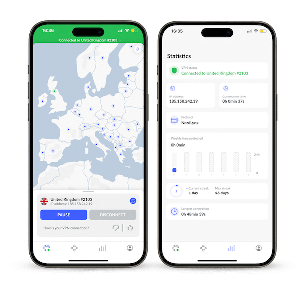 De eerste keer openen gaat soepel, op één ding na: je kunt niet inloggen in de app zelf. Je wordt doorgestuurd naar een browservenster, logt in op je Nord-account, en wordt dan teruggestuurd. Het werkt, maar het voelt onnodig omslachtig voor een betaalde app. Dat gezegd zijnde: daarna merkt je er niets meer van. Quick Connect kiest automatisch de snelste server, Siri-integratie werkt, en widgets op je beginscherm ook. Verbinding maken duurt letterlijk twee seconden.