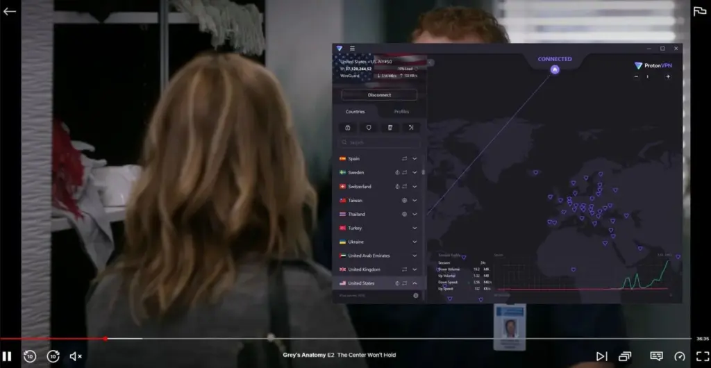 Waar ProtonVPN zich onderscheidt, is VPN Accelerator. Die functie staat standaard aan en doet drie dingen: het splitst de verbinding tussen jou en de VPN-server in kortere paden, gebruikt het BBR-algoritme om sneller te herstellen van pakketverlies, en verdeelt de OpenVPN-belasting over meerdere CPU-threads. In de praktijk maakt dat vooral verschil op langere afstanden. Op onze 500 Mbps-verbinding hield ProtonVPN via een US Plus-server 410 Mbps over. Netflix US in 4K begon binnen vijf seconden met laden, zonder buffering gedurende vier uur.