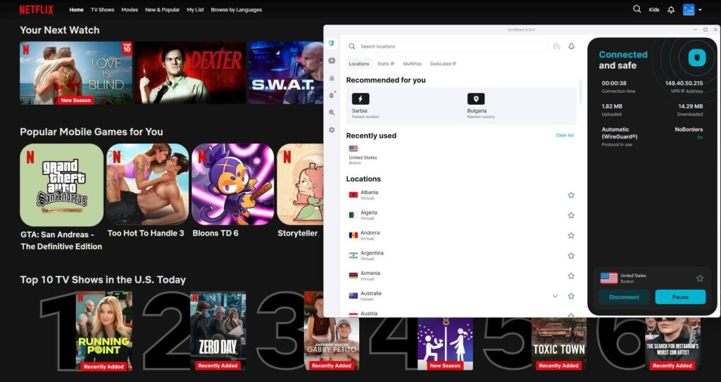 Niet elke server werkte direct. Bij Brazilië en Mexico moesten we twee of drie keer wisselen voordat de juiste bibliotheek verscheen. Eenmaal verbonden bleef de stream stabiel. Op onze 500 Mbps-verbinding hield Surfshark via WireGuard 425 Mbps over. 4K-content laadde zonder buffering.