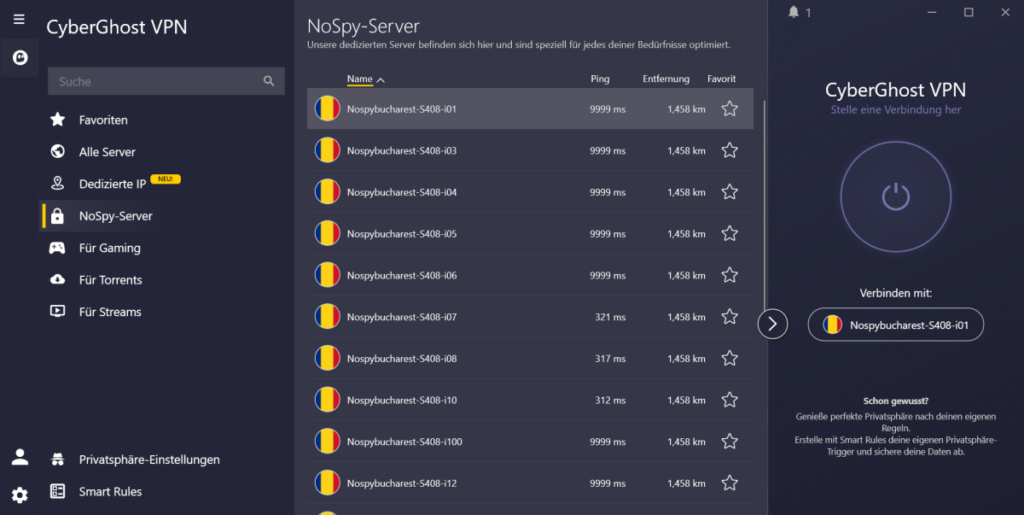 - NoSpy Servers: Dit zijn unieke servers die volledig eigendom zijn van CyberGhost en beheerd worden vanuit hun beveiligde datacentrum in Roemenië. Omdat er geen derde partijen bij betrokken zijn, bieden de NoSpy Servers een extra laag privacy en controle over de infrastructuur.