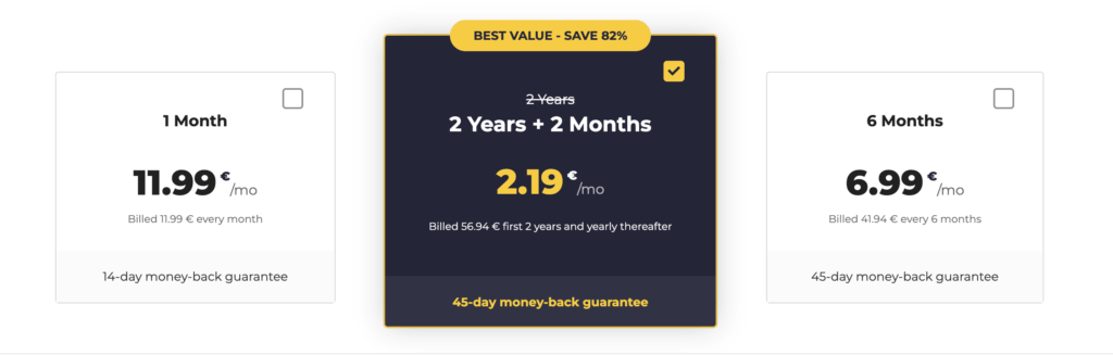 Beste prijs (langetermijn) | €2,19 per maand | €3,09 per maand | €1,99 per maand |