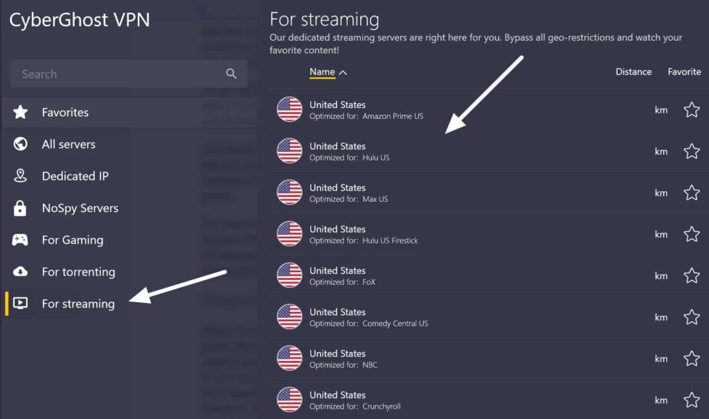 CyberGhost onderscheidt zich van veel concurrenten door openlijk geoptimaliseerde streaming servers aan te bieden. In de app vindt u deze servers gecategoriseerd per dienst (bijvoorbeeld ‘Netflix US’, ‘BBC iPlayer’ of ‘Max’). Het voordeel hiervan is dat deze IP-adressen actief worden onderhouden en snel worden vervangen wanneer streamingplatforms blokkades instellen.
