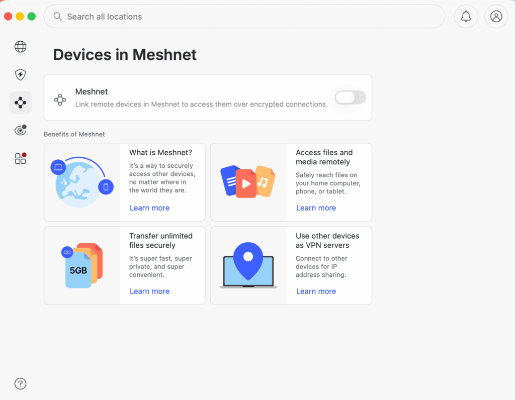- Het is gratis. Je hoeft er geen extra abonnement voor te nemen, het zit standaard in elk NordVPN-pakket. Zelfs zonder NordVPN-abonnement kun je Meshnet alleen al gebruiken (al heb je dan geen toegang tot de gewone VPN-servers).