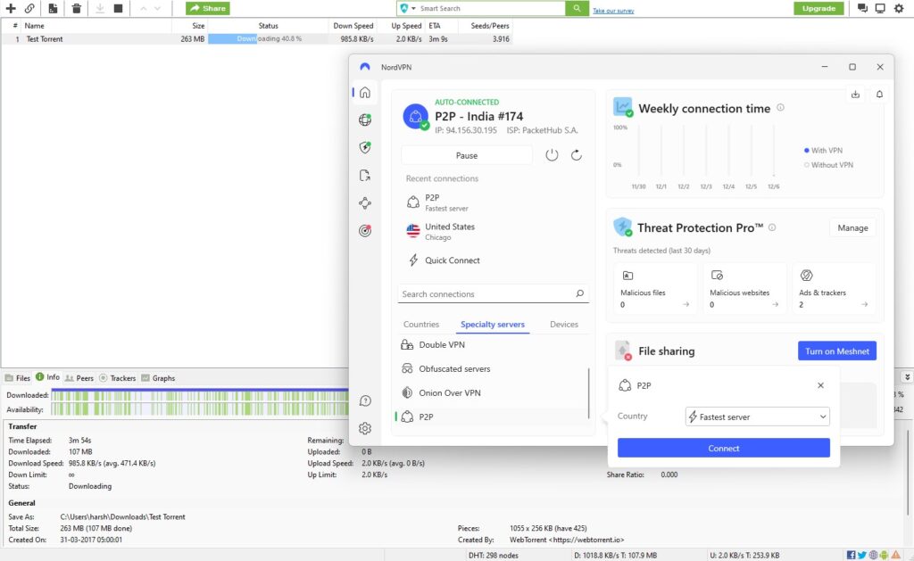 Je vindt ze in de app onder “Specialty servers” > “P2P”. De app kiest automatisch de snelste, maar je kunt ook handmatig een land kiezen. Tip: kies een server in een buurland, niet je eigen land. Iets verder weg, maar buiten je eigen jurisdictie.