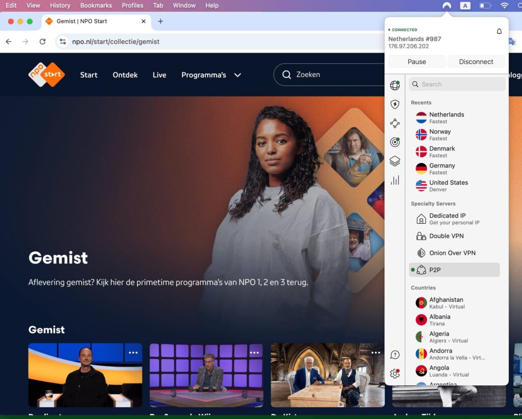 Verbind via de VPN met een server in Nederland, open npo.nl of de NPO-app, en de stream start alsof je op de bank in Amsterdam zit.