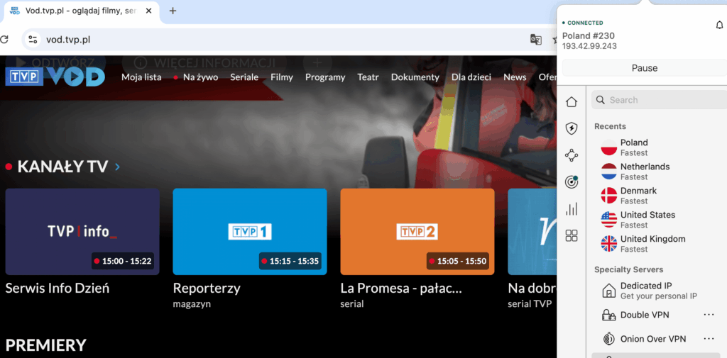 In onze tests werkte NordVPN perfect om Poolse TV te ontgrendelen, zoals bijvoorbeeld TVP VOD
