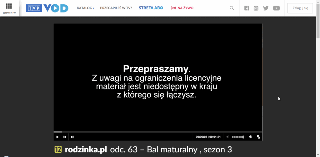 Ziet de streamingdienst een Nederlands IP-adres? Dan krijg je een foutmelding dat de content niet beschikbaar is in jouw regio. Dit gebeurt omdat de zender alleen licenties heeft om content in Polen uit te zenden.