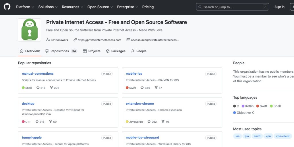PIA is een van de weinige grote VPN-providers die al zijn client-apps volledig open source heeft gemaakt. De broncode van de Windows-, macOS-, Linux-, Android- en iOS-apps staat op GitHub. Iedereen kan de code inspecteren op backdoors of slordige implementaties.
